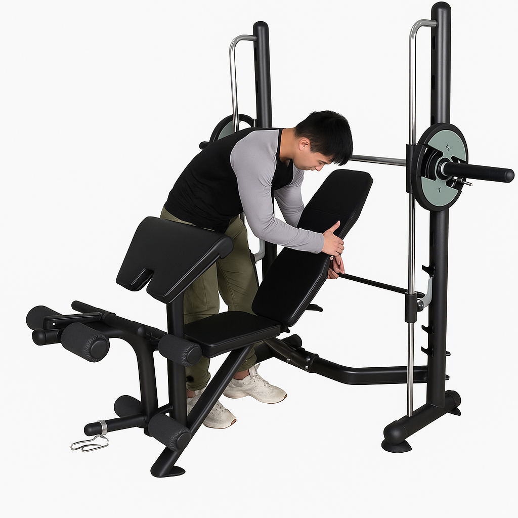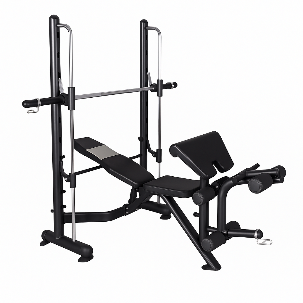The Aurelius Pro Smith Bench G9 is a premium, all-in-one weight bench and guided smith trainer designed for serious home gyms and boutique studios. Built on a heavy 11-gauge steel chassis with linear-bearing uprights, it pairs a FID bench with integrated preacher curl and leg developer to unlock full-body training in a compact footprint. Counterbalanced bar, adjustable safety stops, and pro-grade upholstery deliver smooth, quiet sessions that match the feel of commercial equipment.
